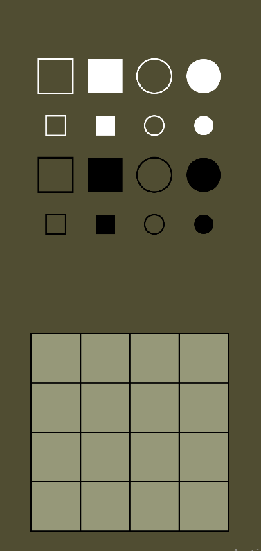Quarto has a 4×4 board and 16 pieces. Each piece has four dichotomous attributes — color, height, shape, and consistency — so each piece is either black or white, tall or short, square or round, and hollow or solid. The object is to place the fourth piece in a row in which all four pieces have at least one attribute in common. The twist is that your opponent gets to choose the piece you place on the board each turn.